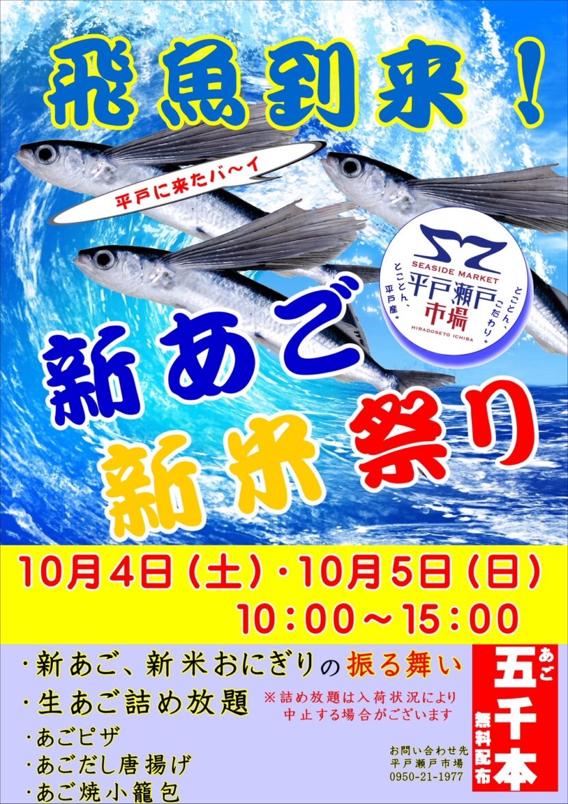 10月4日(土)・5(日)、平戸名物「あご(飛魚)」の到来、そして新米収穫にあわせて、『新あご・新米祭り』を開催いたします。